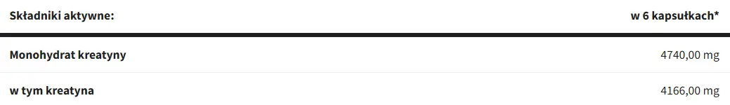 86 % Kreatinmonohydrat, Kapselhülle [Überzugsmittel (Hydroxypropylmethylcellulose)], Trennmittel (Magnesiumsalze von Fettsäuren). Das Produkt kann folgende Allergene enthalten: Milch, Soja, glutenhaltiges Getreide, Fisch, Weichtiere und Erdnüsse.