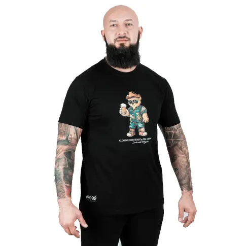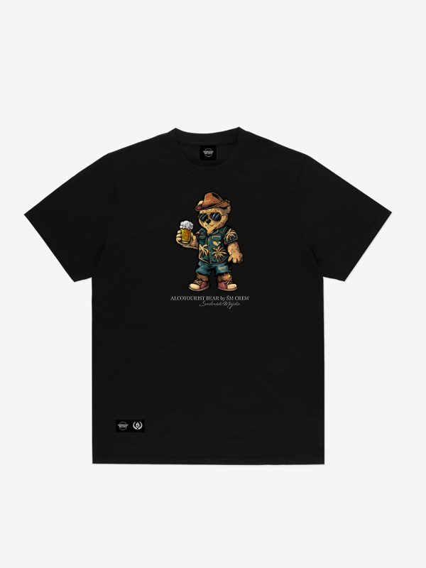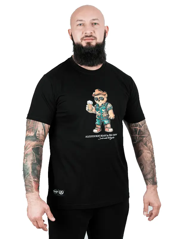 Das T-Shirt „Alcotourist Bear” ist schwarz, wodurch es universell einsetzbar ist und sich leicht mit anderen Kleidungsstücken kombinieren lässt.