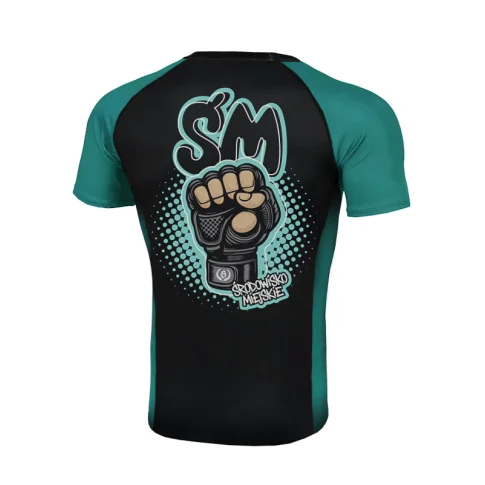 Der Rashguard „Fist” ist nicht nur funktional, sondern hat auch ein kraftvolles, sportliches Design. Die Kombination aus Schwarz und kontrastierenden aquamarinfarbenen Ärmeln verleiht ihm ein dynamisches Aussehen, das die Blicke auf sich zieht.