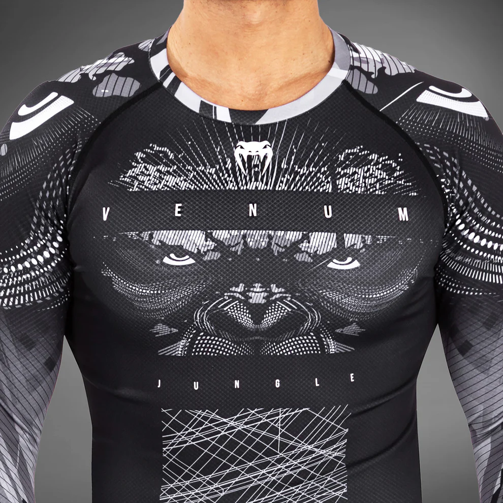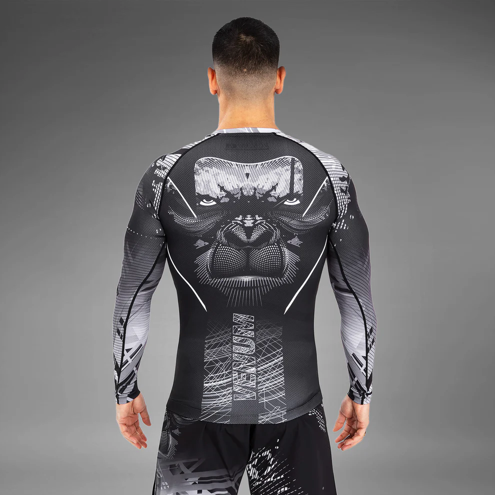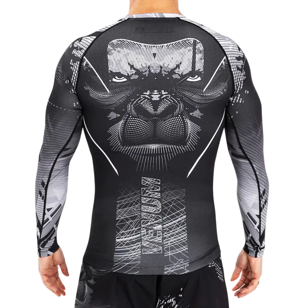 Der Venum Gorilla Jungle Rashguard mit langen Ärmeln in Schwarz-Weiß wurde für Sportler und Wettkämpfer entwickelt und eignet sich ideal für Grappling, BJJ und MMA.